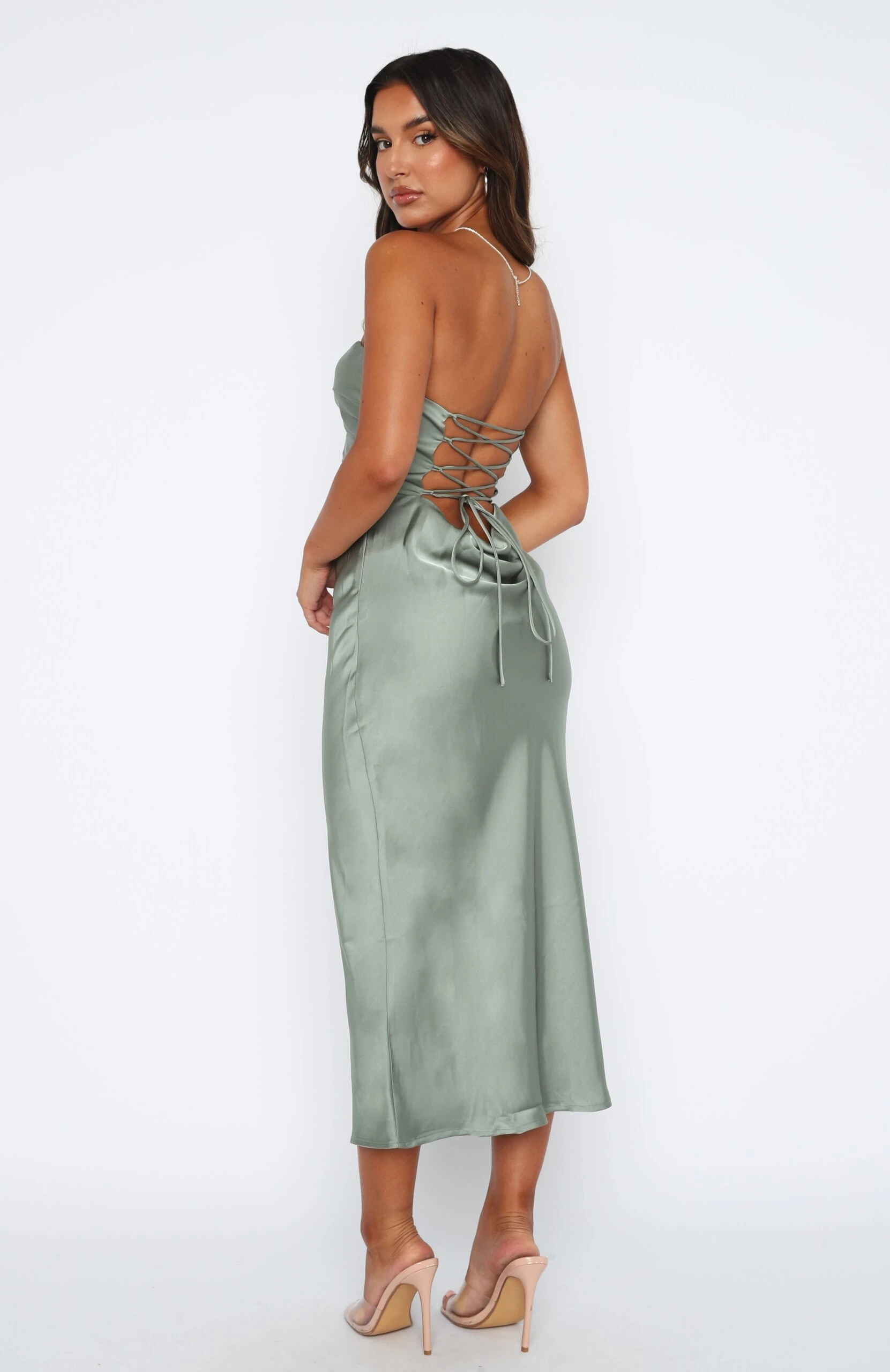 Style and Grace is how we would describe the Elysium Midi Dress in Sage. Featuring a midi length, strapless style, knot front design with cut outs, open back with tie detail and soft silky fabric.