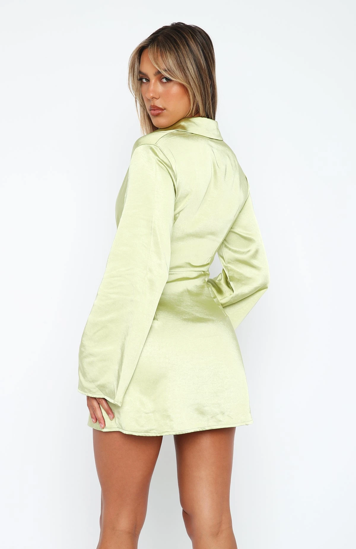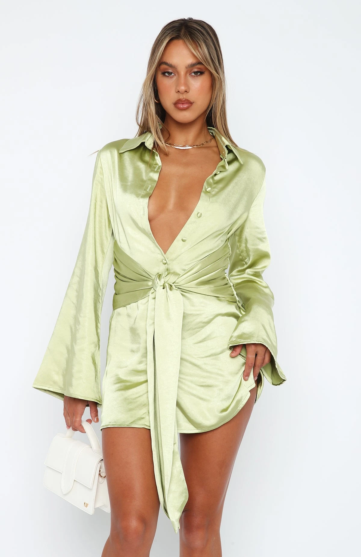 The Night Out Long Sleeve Mini Dress in Matcha speaks for itself. Featuring collared neckline, long sleeves, button-up front closure, front-tie design and lined, silk-feel fabric. Pair with gold accessories and perspex heels and get ready to be best dressed at your next event!