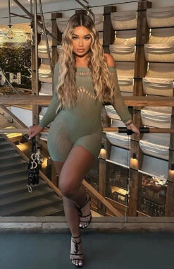 Dare to go bold this season with this No Take Backs Long Sleeve Playsuit in Khaki, it is perfect for your next big event and beyond. Featuring an off the shoulder fit, long sleeves, small cut-out midriff design and delicate sheer, stocking fabric with stretch so one size fits most. Pair with your favourite knee high boots and gold accessories for a fresh new vibe!