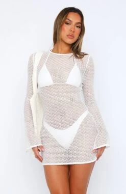 A show stopper that redefines ‘dress to impress’. The With Me Long Sleeve Mini Dress White features long sleeves, backless design with adjustable tie-up detail and sheer, lightweight lace fabric. We love this paired over your favourite White Fox Bikini and with platform slides for a look we are obsessed with! Style with the platform slide for a beach day with the girls!